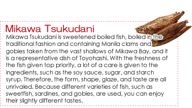 Hamanatto, and Mikawa tsukudani (preservable food boiled down in soy sauce), have long been developed as part of a unique food culture that has continued for other 100 years.