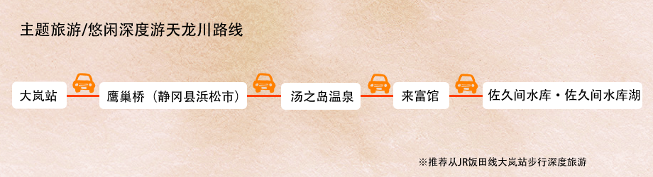 游览给穗之国带来恩惠的3个水系之一的天龙川。请从静冈县的JR饭田线大岚站出发,然后渡过鹰巢桥后来到爱知县,在佐久间湖附近的汤之岛温泉泡个温泉。最后在来福馆休息,观赏佐久间水库湖的景观。