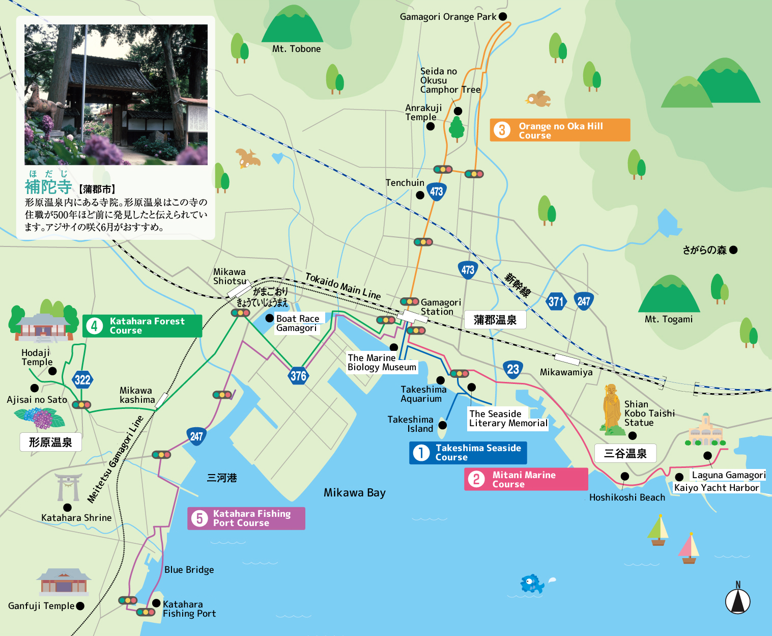 This course focuses on the seaside of Gamagori. There are great sightseeing spots at each course including the beautiful view of the ocean. Enjoy these leisurely courses while visiting tourist spots. There is also a complete lineup of rest stops. Have a great time cycling and trying out all the delicious food.