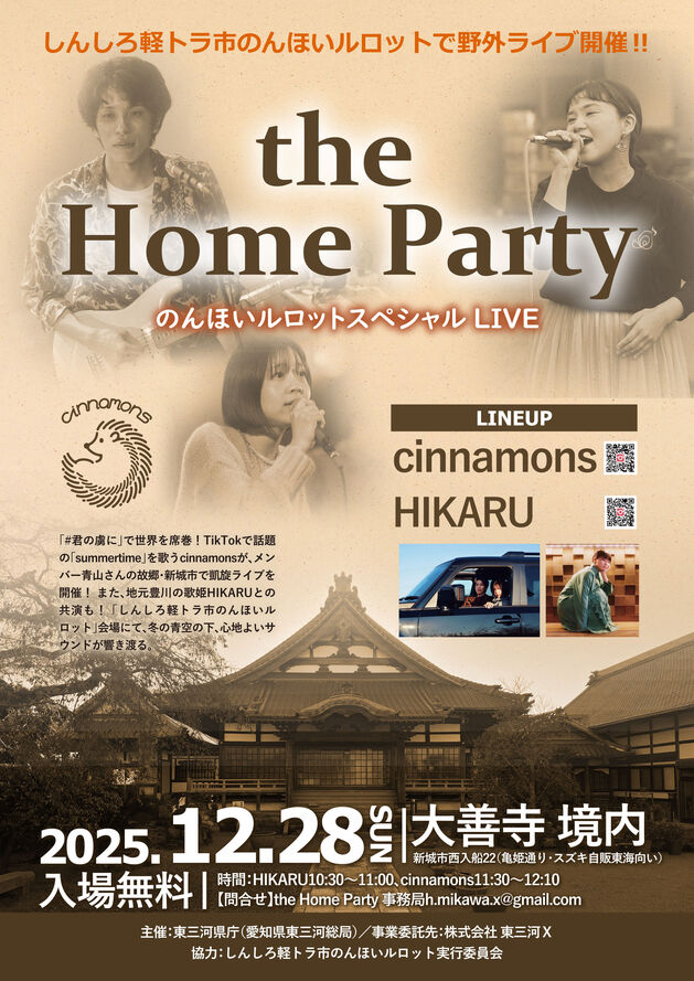 東三河県庁では、人口減少・高齢化による地域活動の担い手不足に対応するため、今後、地域の担い手として期待される若者や外国人に東三河地域への関心を持っていただくための取組を行っています。その一環として、しんしろ軽トラ市のんほいルロット※の会場内で、新城市にゆかりのあるアーティストによるスペシャルライブを開催します!