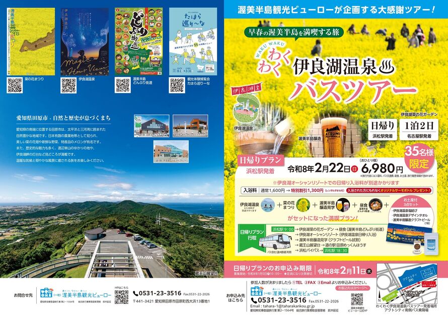 ■コース:浜松駅=伊良湖菜の花ガーデン=昼食=伊良湖オーシャンリゾート(日帰り入浴)=渥美半島醸造見学(クラフトビール試飲)=蔵王山展望台=道の駅田原めっくんはうす=浜松駅