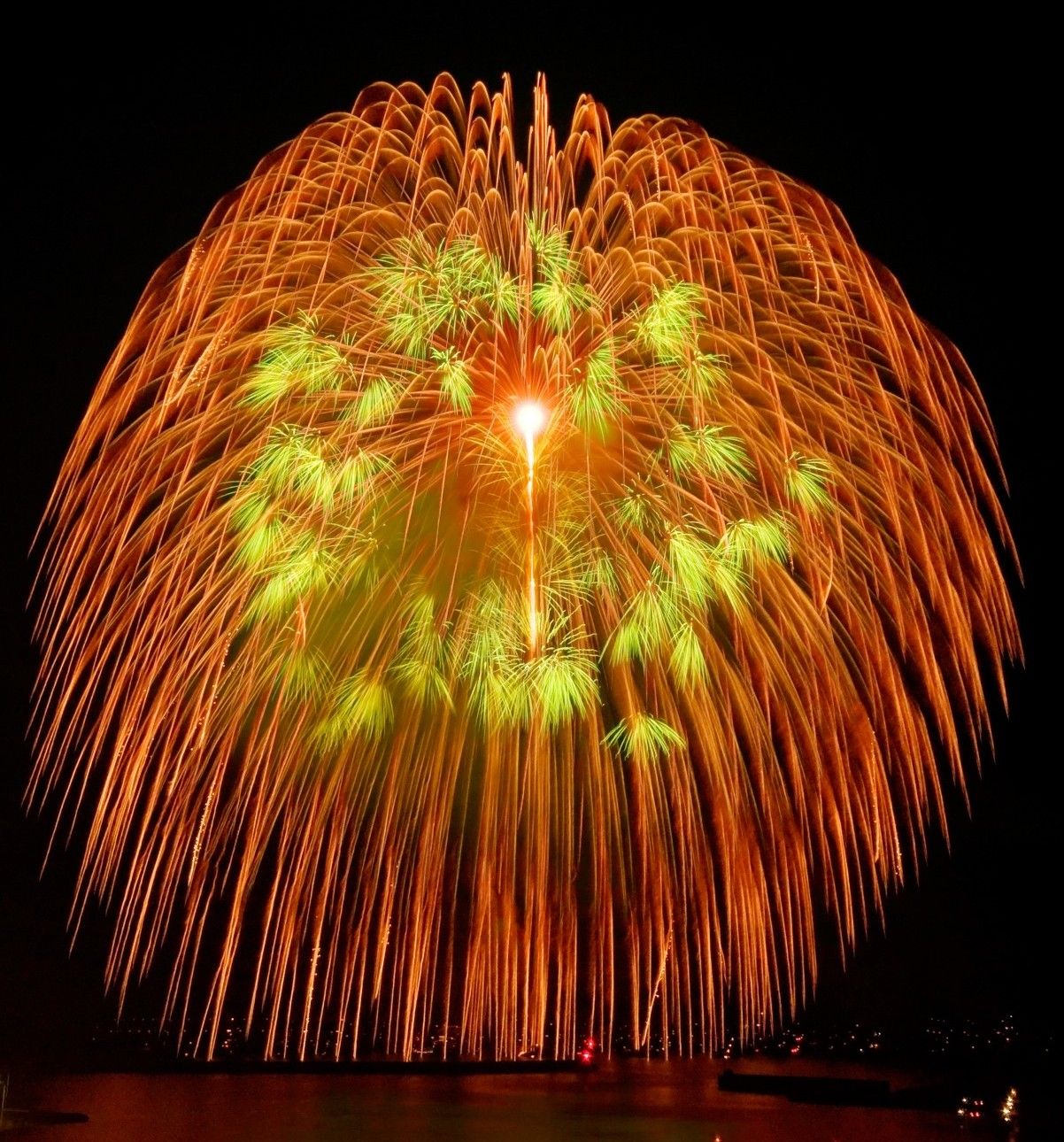 納涼花火大会の目玉は、直径90cmの花火「正三尺玉」。この花火は海上にある台船から打ち上げられ、開いたときの直径は650mと空に打ち上げられる花火では太平洋岸最大で、一晩に種類の異なる3発が上がります。