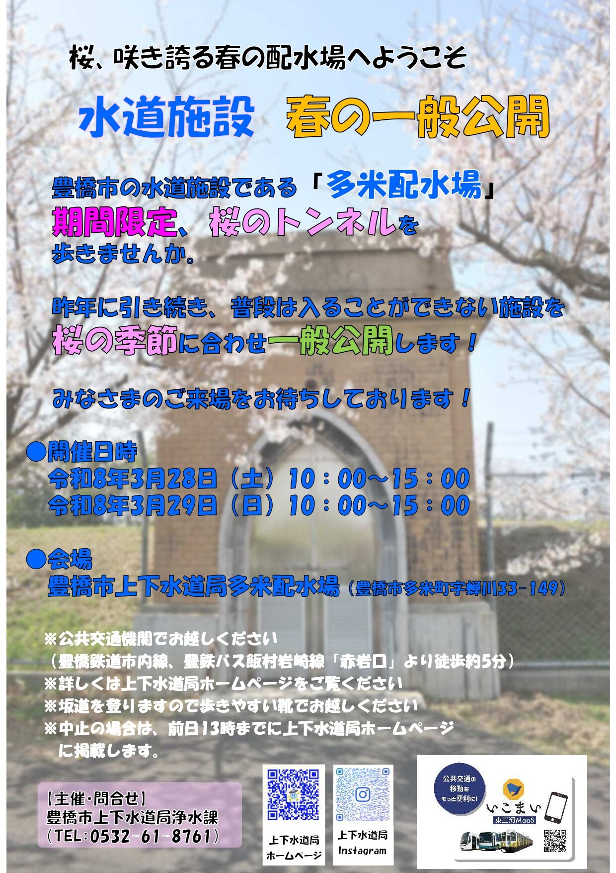 一覧はコチラ\桜、咲き誇る春の配水場へ/水道施設 春の一般公開 普段は入ることのできない水道施設を桜の季節に合わせ一般公開します。 開催日時:令和8年3月28日(土)・29日(日)10:00~15:00 ※小雨決行・荒天中止 ※中止の場合は前日13時までに上下水道局ホームページに掲載します会 場 :豊橋市上下水道局多米配水場(豊橋市多米町字蝉川33-149) お問合せ:豊橋市上下水道局浄水課 TEL 0532-61-8761 ★詳細はこちら→豊橋市上下水道局ホームページへ