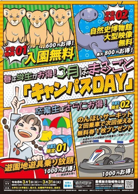 のんほいパークでは学生の皆様の春休み・卒業シーズンにあわせ、お得な期間限定キャンペーンを開催します! 開催期間:令和8年3月1日(日)~3月31日(火) ※期間中は何度でもお楽しみいただけます! ※3月30日(月)は臨時開園します。開園時間:9:00~16:30(入園は16:00まで)休園日 :月曜日(月曜日が祝日の場合は翌平日)イベントについて:【対 象】大学生(大学院生)、短大生、各種専門学校生、高校生【特 典】対象者全員:入園料無料、自然史博物館大型映像無料 卒業生には更に! 遊園地遊具乗り放題(一部遊具除く)& のんほいサーキット2回乗車で次回使える無料券1枚プレゼント!【その他】入園時に記入用紙に必要事項を記入のうえ、改札スタッフにお渡しくだ...