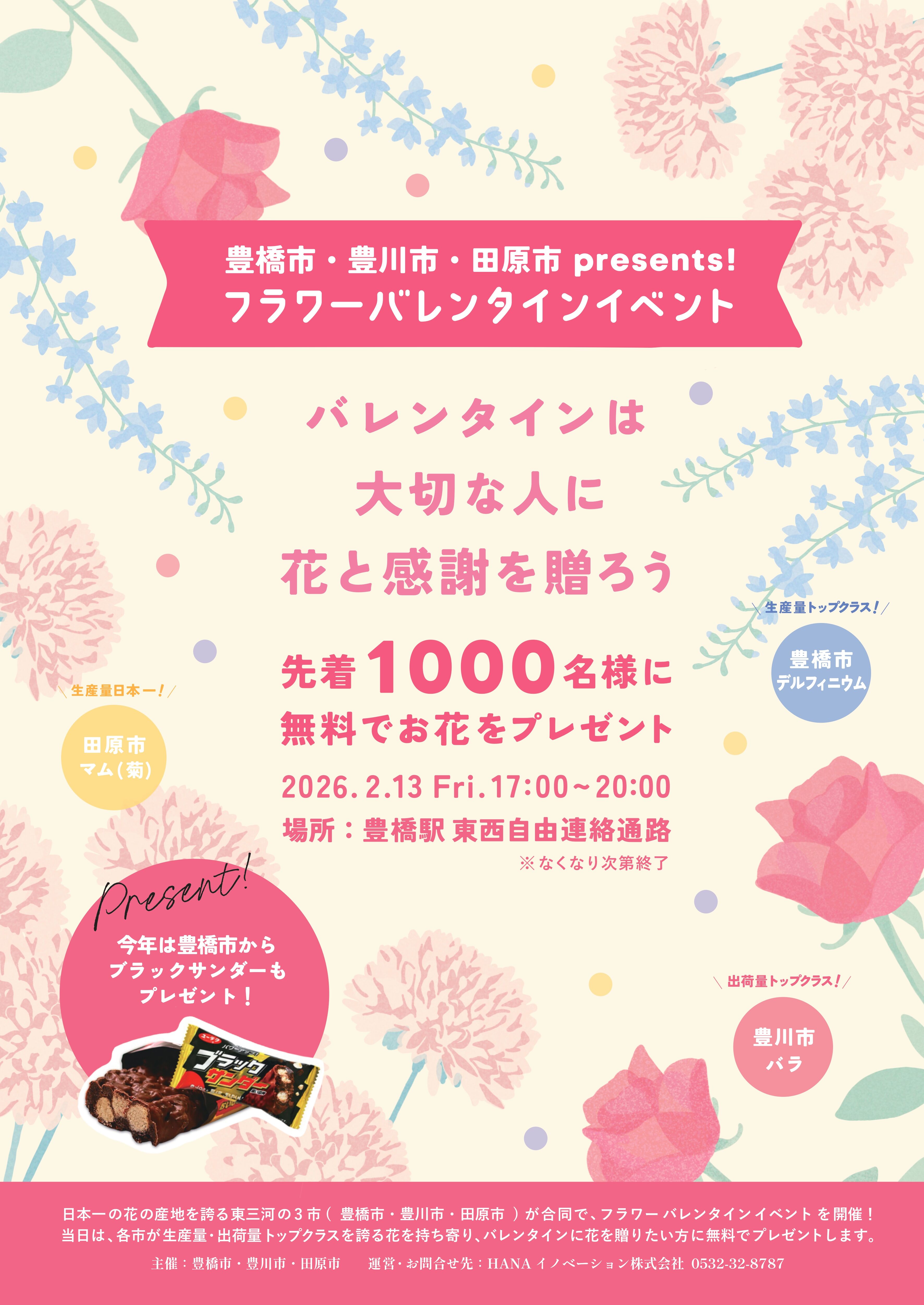 日本一の花の産地を誇る東三河の3市(豊橋市・豊川市・田原市)が合同で、フラワーバレンタインイベントを開催します。当日は、各市が生産量・出荷量トップクラスを誇る花を持ち寄り、バレンタインに花を贈りたい方に無料でプレゼントします。 日 時:2026年2月13日(金)17:00~20:00場 所:豊橋駅 東西自由連絡通路定 員:先着 1,000名様その他:花がなくなり次第終了します。