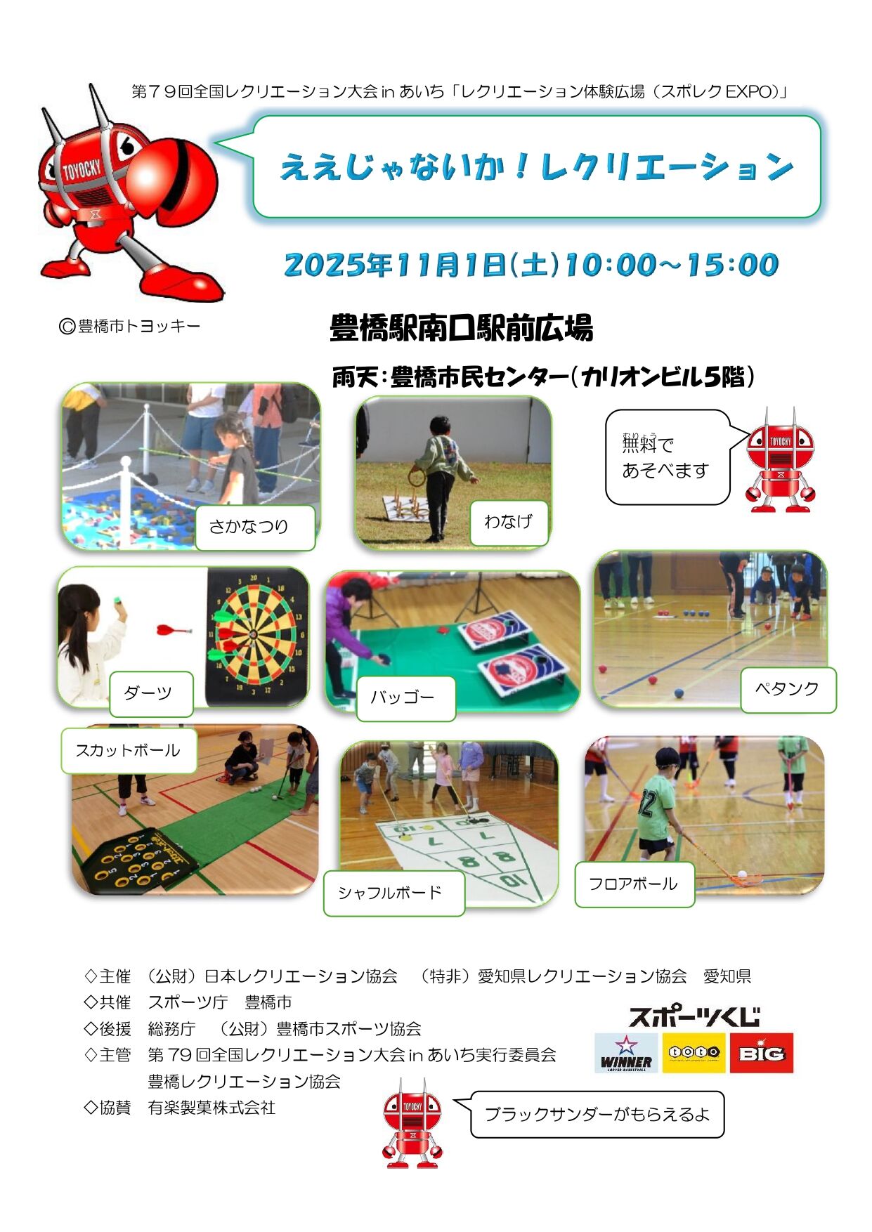 体験種目:シャフルボード、ダーツ、ペタンク、魚つり、バッゴー、フロアボール、スカットボール、輪投げ