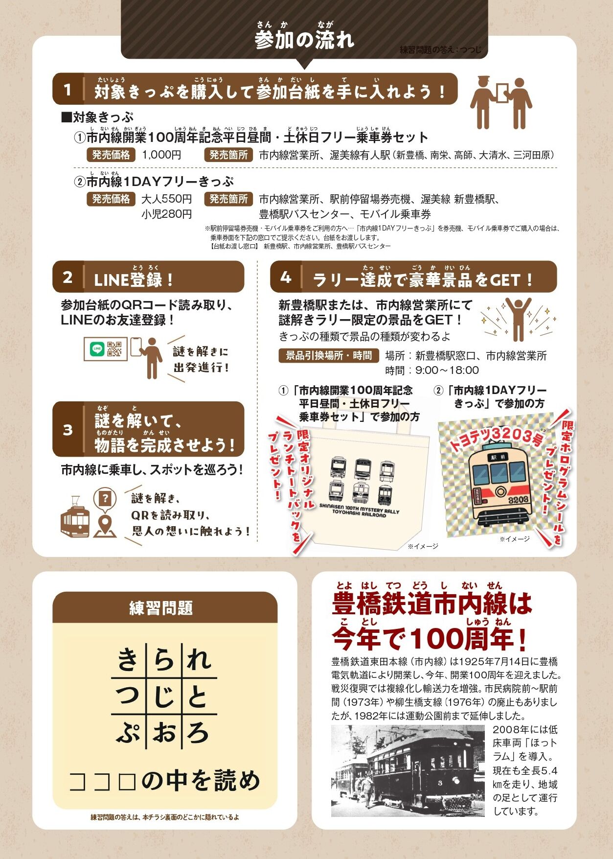 豊橋鉄道 市内線は、「市内線開業100周年記念企画」第2弾として、新たなラリーイベント「謎解きラリー ~失われた記憶と市内線100年の軌跡~」を開催いたします。