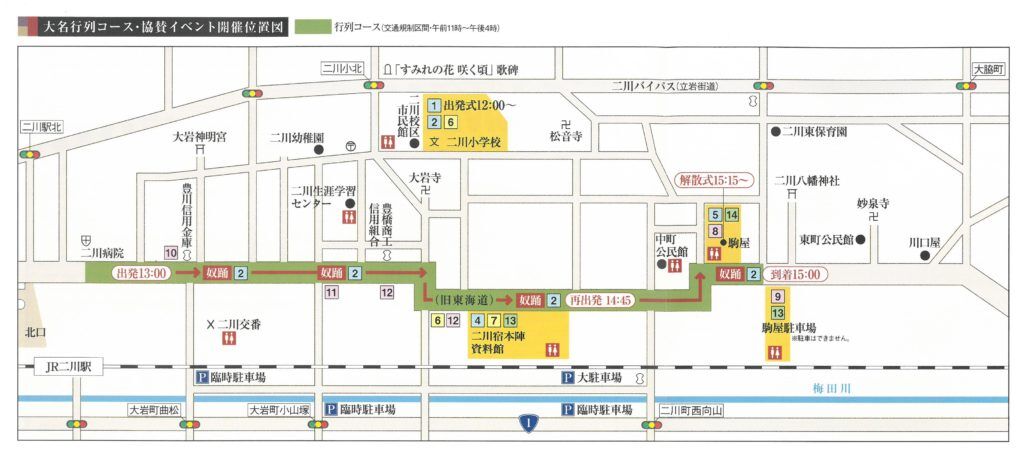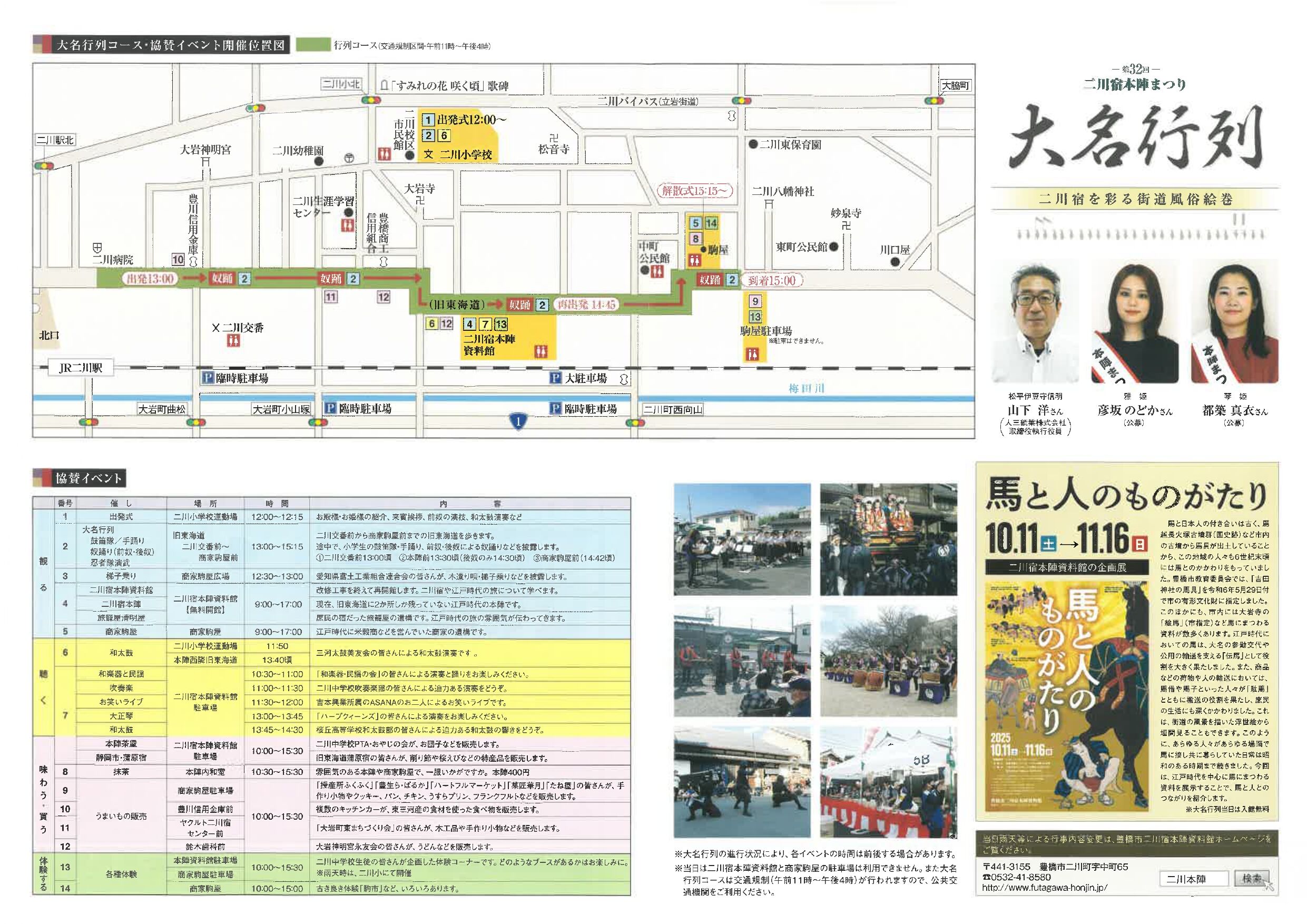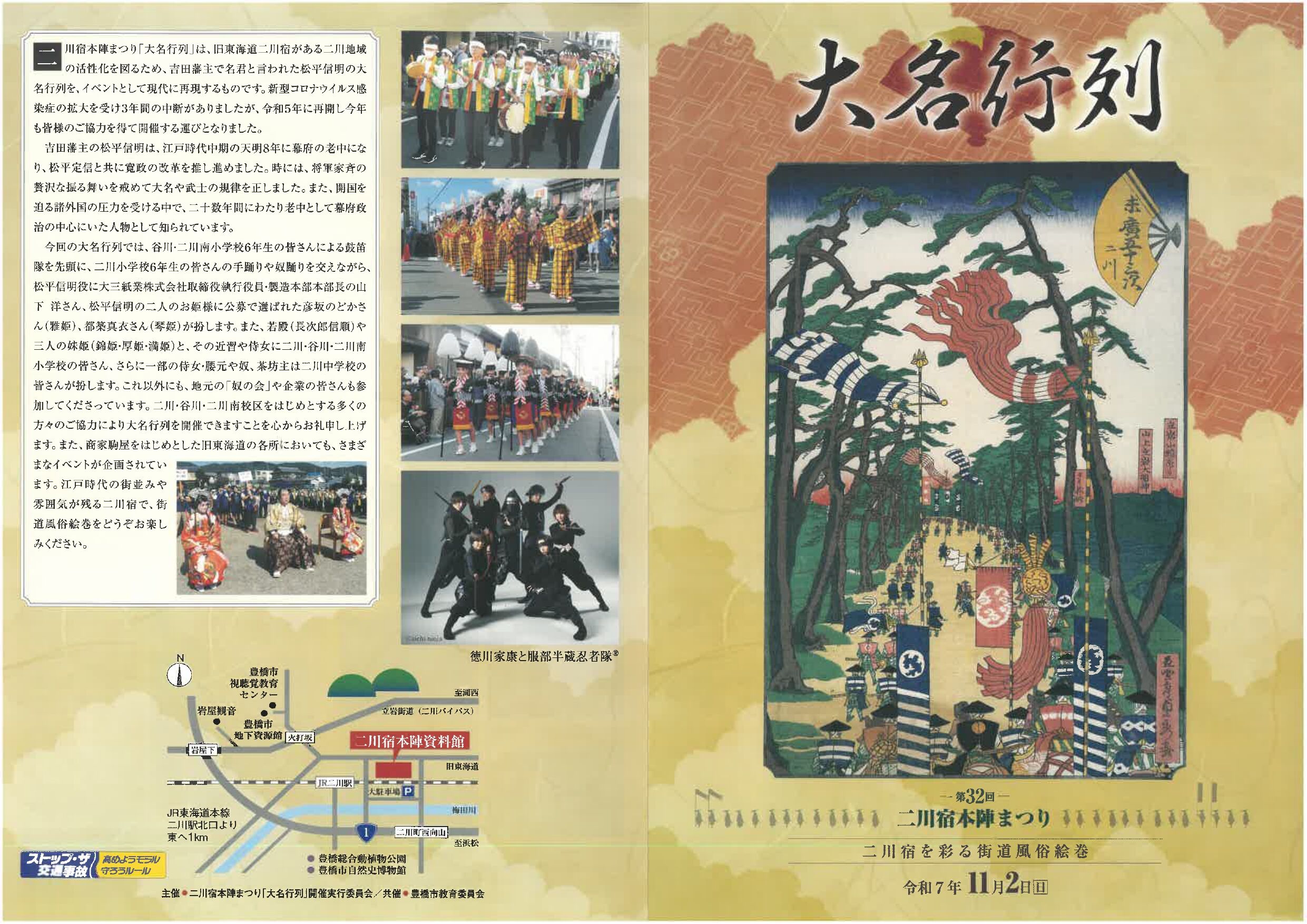 江戸時代に東海道五十三次の二川宿が置かれていた二川地域の活性化を図るため、吉田藩主の名君とうたわれた松平伊豆守信明(まつだいらいずのかみのぶあきら)の大名行列をモデルに、時代風俗絵巻を再現します。