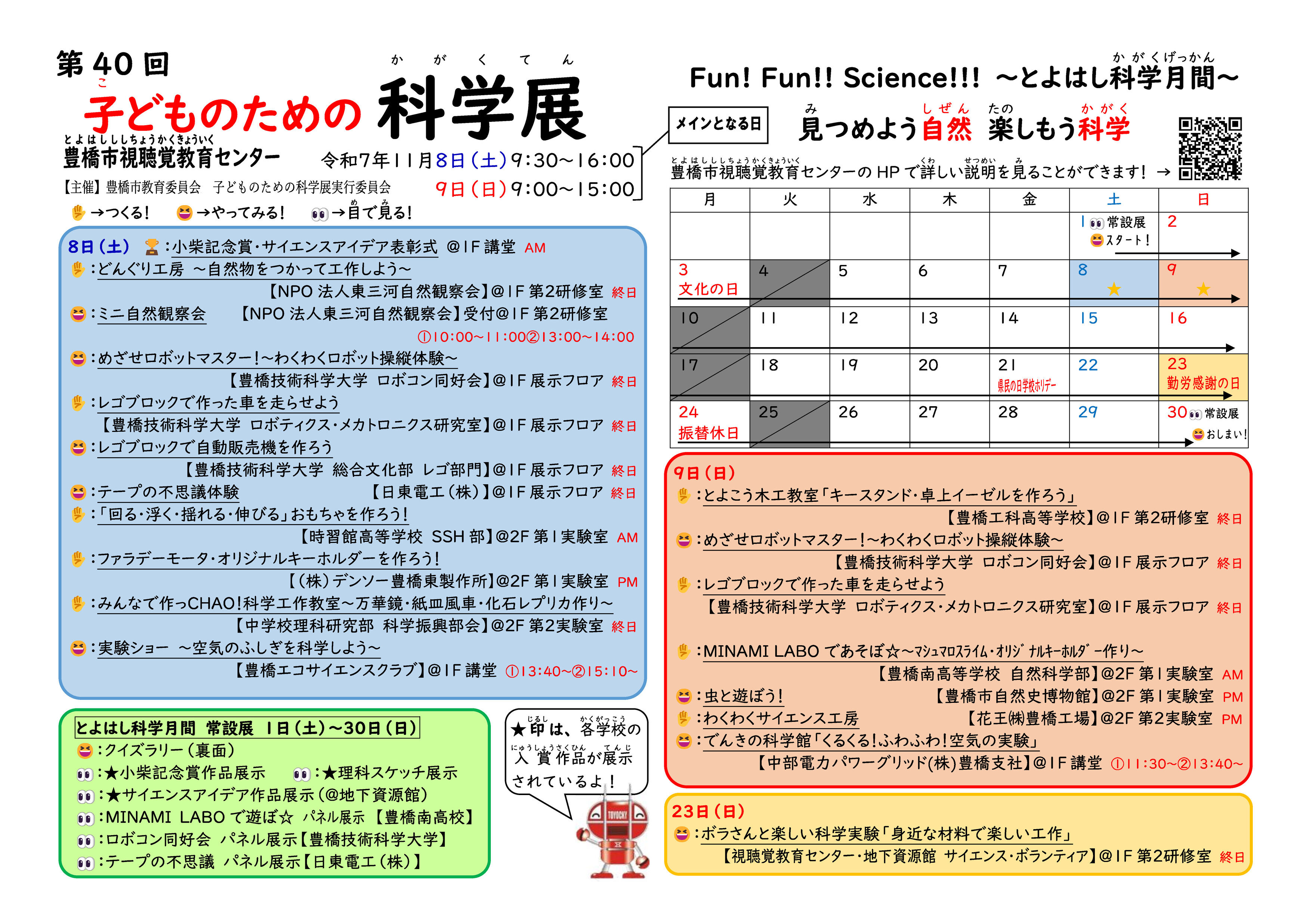 「見つめよう自然、楽しもう科学」をテーマに、企業や大学高校による科学体験・工作、小中学生による科学作品展などご覧いただけます。