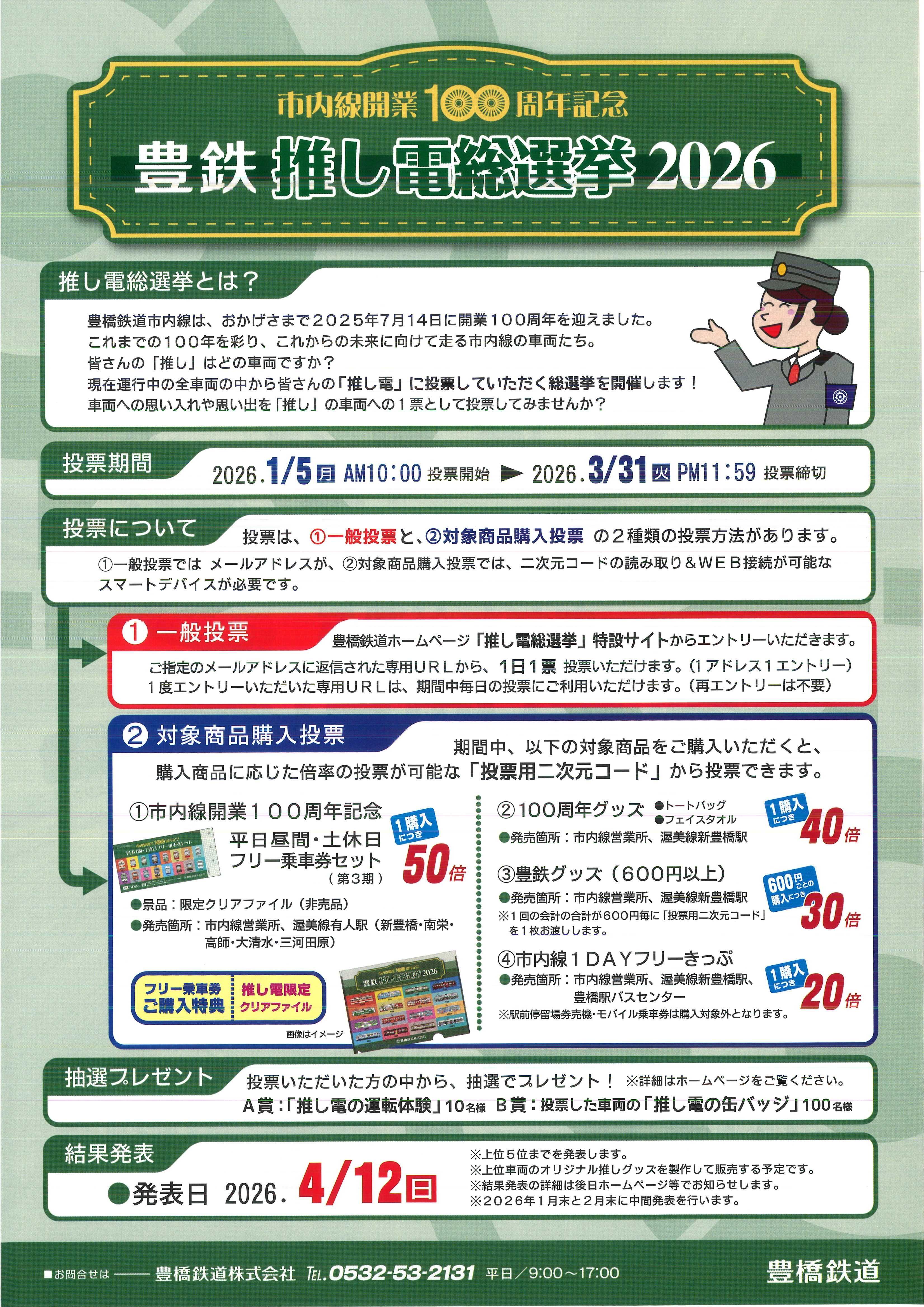 豊橋鉄道株式会社は、「市内線開業100周年記念企画」第3弾として、市内線車両の人気投票企画「豊鉄 “推し電”総選挙2026」を実施します。