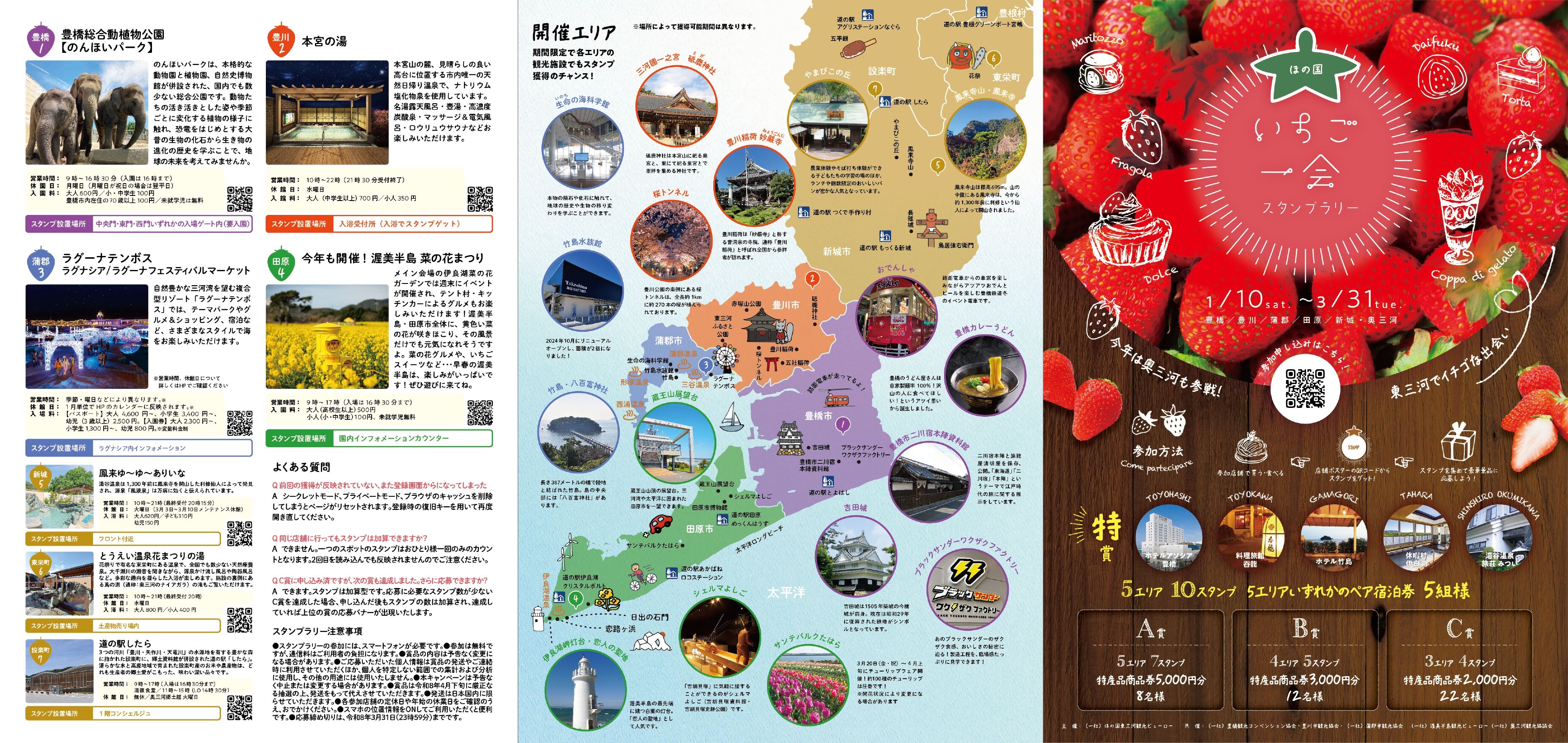 5エリア(豊橋、豊川、蒲郡、田原、新城・奥三河)の各店舗・施設を巡り、スタンプを集めて応募すると抽選で豪華賞品が当たります。
