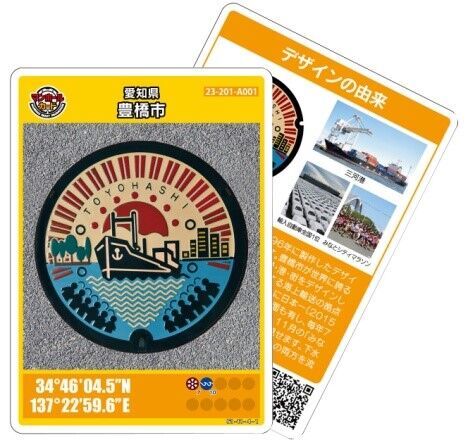 豊橋市では「見える下水道」を目的として制作したデザインマンホールが3種類(“三河港”、“市電と公会堂”、“手筒花火と吉田城”)あり、このデザインをカード化したマンホールカードを希望者に配布しております。