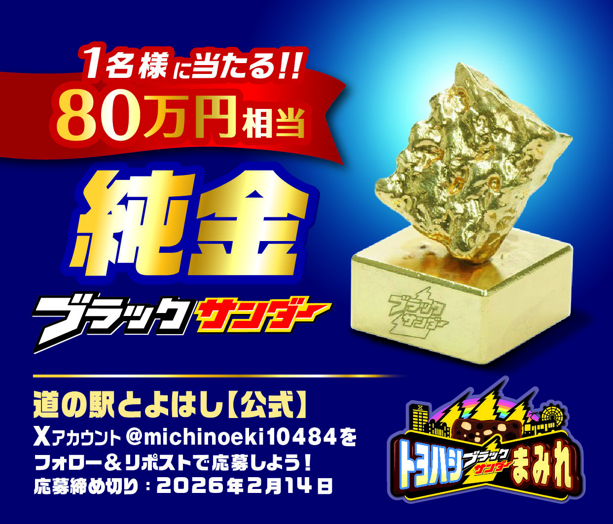 道の駅とよはし 公式Xアカウント(@michinoeki10484)をフォローし、該当投稿をリポストすると、80万円相当の純金製ブラックサンダーの置物が抽選で1名様に当たります。 応募締切:2月14日(土)23:59まで