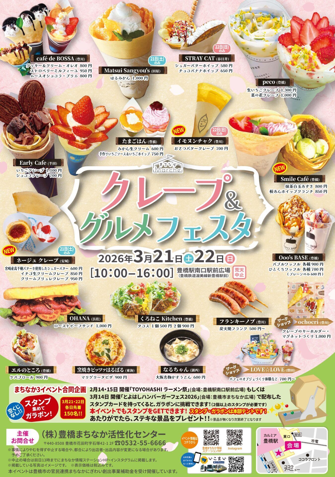 ㈱まちなか活性化センターが主催する、下記①~③の対象イベントのうち、2つ以上に来場してスタンプを集めると、③「クレープ&グルメフェスタ」にてガラポンに挑戦できます。