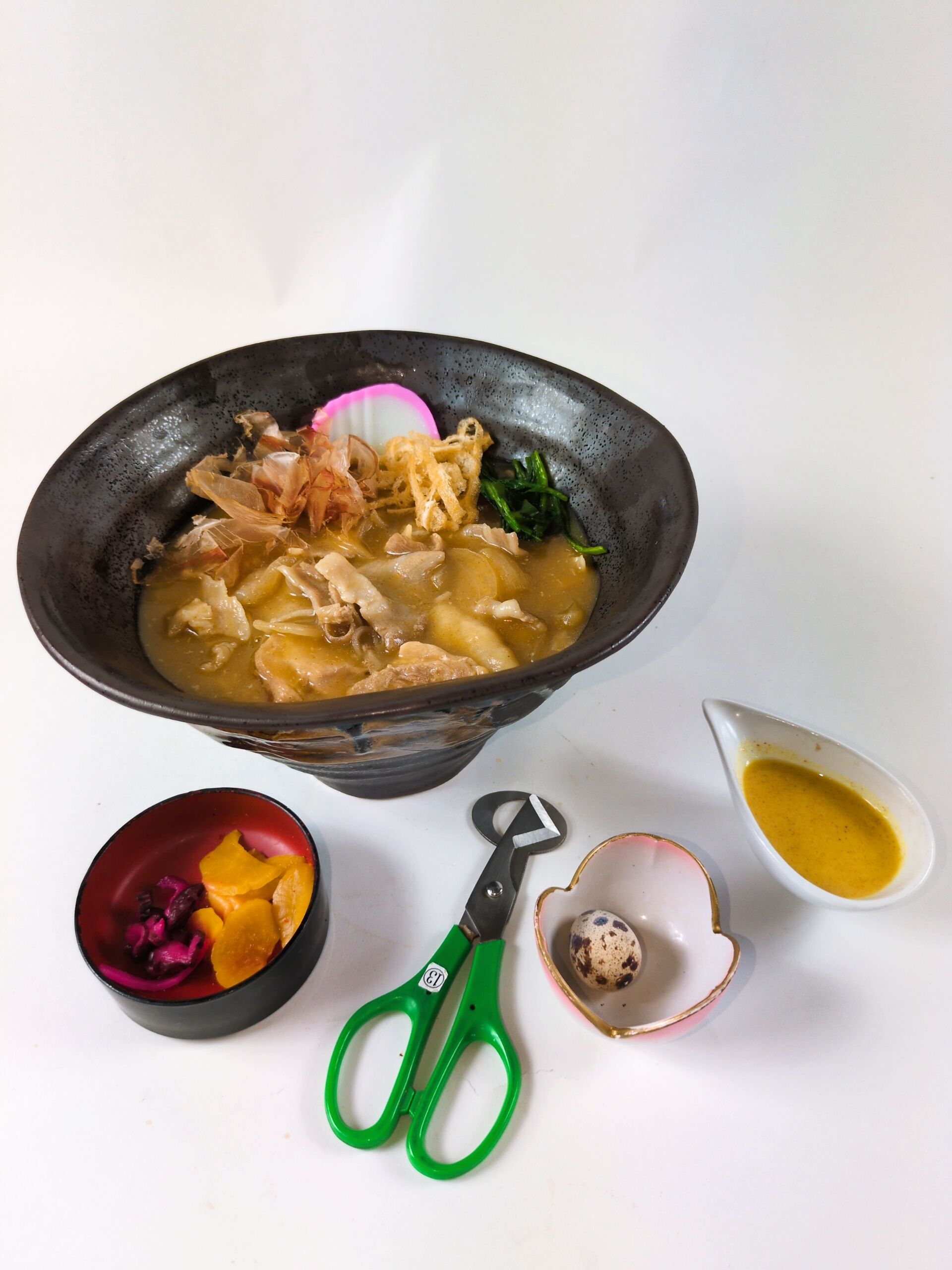 えっ!?これってにかけうどんでは?!いえいえ、いえいえ、見かけは“にかけ”、中身は“カレー”、その名も東京庵本店の豊橋カレーうどん!! うどんは“にかけ”をイメージした和風で、ご飯が出てきたところで「追いカレールー」を混ぜてスパイシーな洋風で味わえます。さらに、この「ハサミ」っぽいの何?!と思った方、豊橋の誇る「うずらカッター」を是非ご来店のうえ、実際に体験してください! 豊橋カレーうどん(ポーク・チキン)1,200円 豊橋カレーうどん(鴨肉)※1日3食限定1,400円